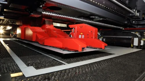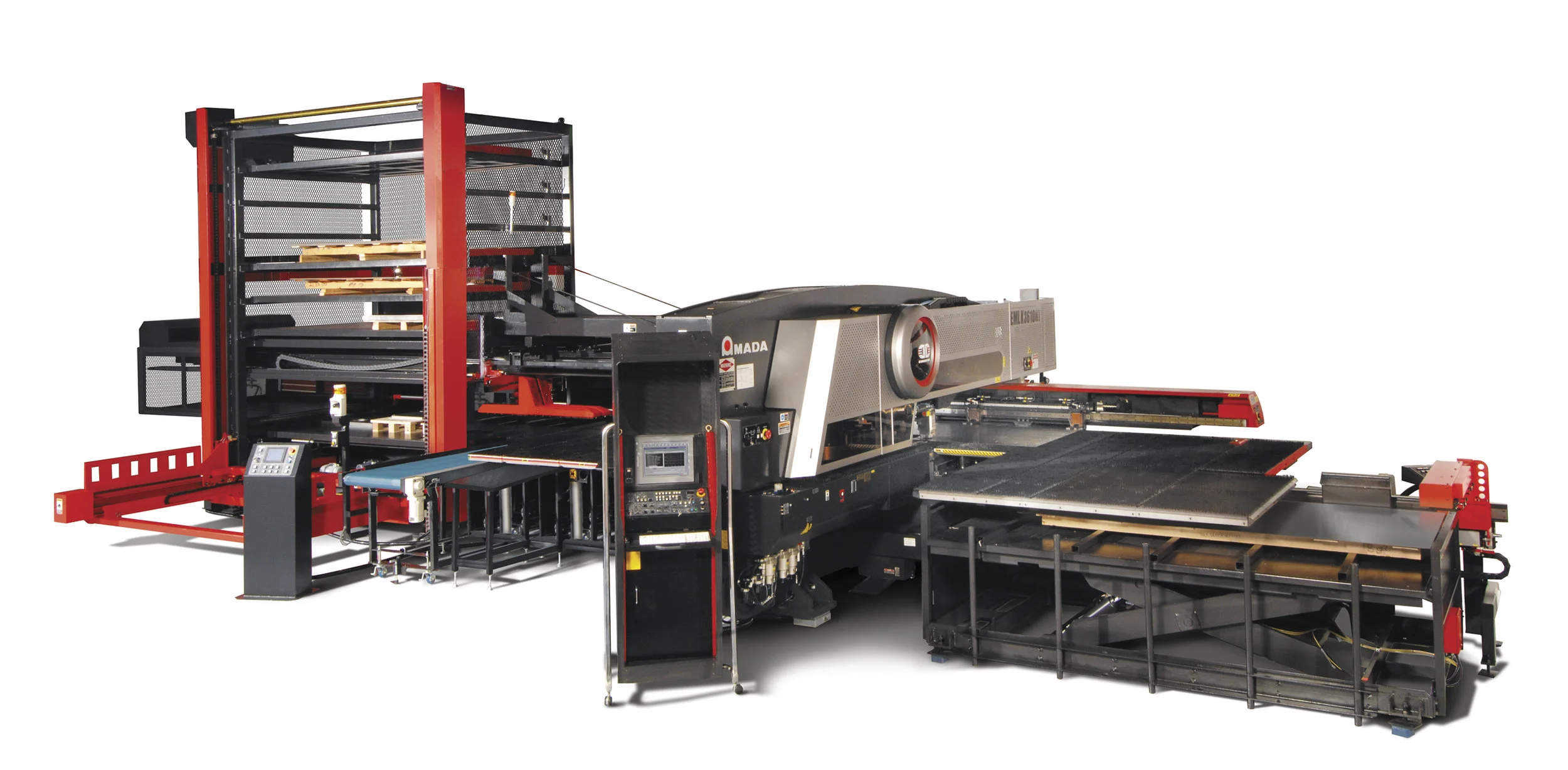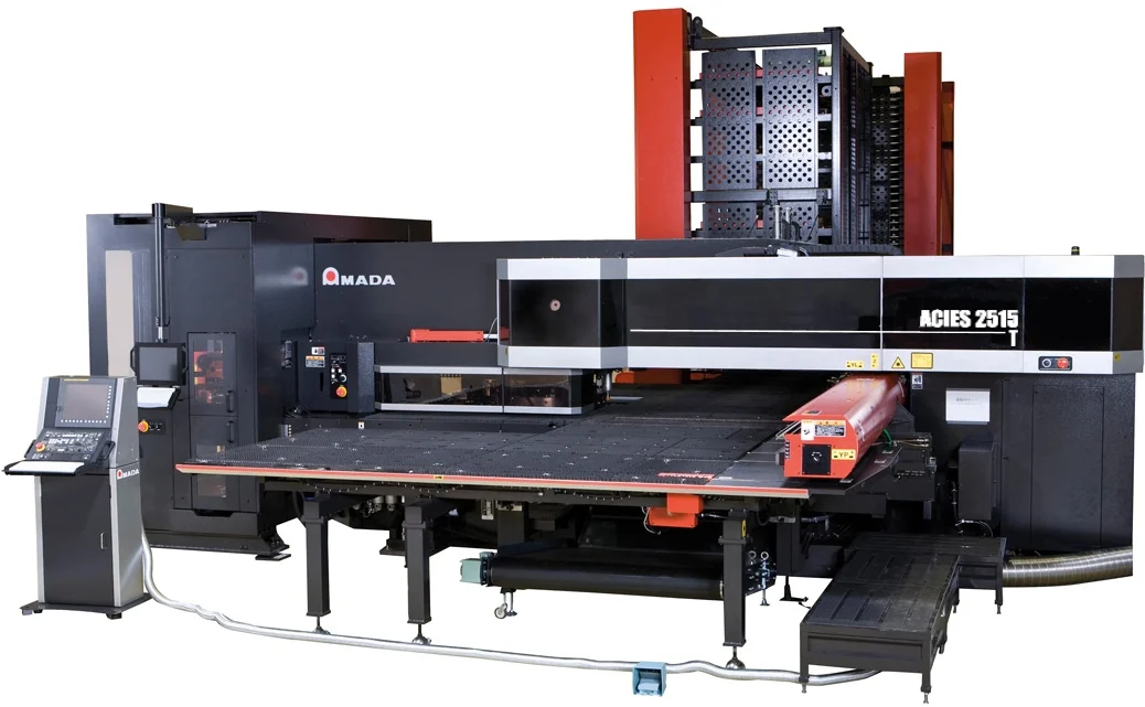 When you combine a laser system with a turret, you achieve unmatched performance and versatility. The Amada ACIES boasts rapid hit rates and a tooling library capable of holding 300 tools, say bye-bye to long human interactive tool setups, with an automated tooling library setups are a breeze. New technology introduced by Amada now allows form ups and form downs, and the ACIES also incorporates live tool centers for thread tapping all in one machine.